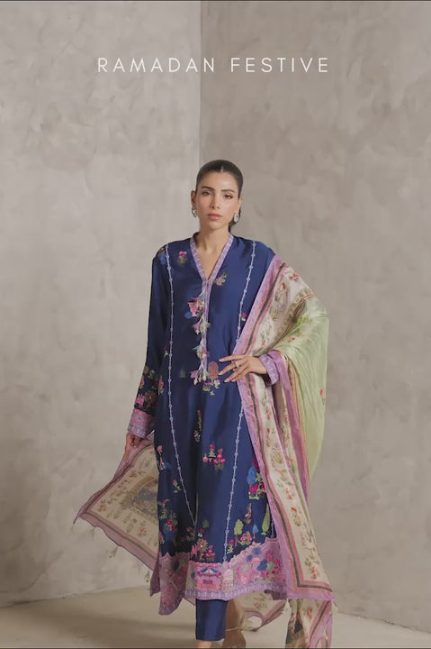 Delivery in 2-3 WeeksA royal scene rendered in thread on navy pure kora silk. The kameez is scattered with dainty embroidered motifs inspired by Mughal miniature paintings, marking the length and sleeves with vibrant intricacy. Along the hem, a lavender silk applique carries a tableau of bygone courts with regal pagodas, majestic beasts, tiny trees, and blooming florals. Matching silk borders etched with fine geometries edge the steeves, while handmade floral tassels soften the neckline. Straight pants lend the look a simple pause. Completing the ensemble, a printed silk dupatta carries the story, finished with tasselled pallus. An impeccably detailed composition for celebrations that invite second glances and closer looks.