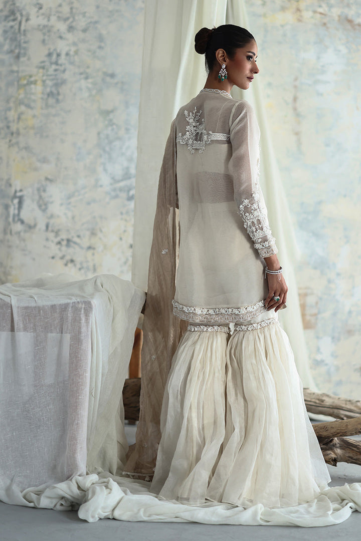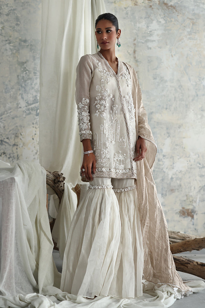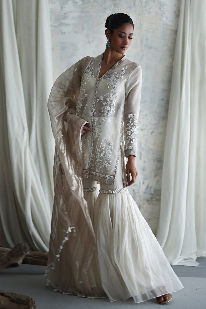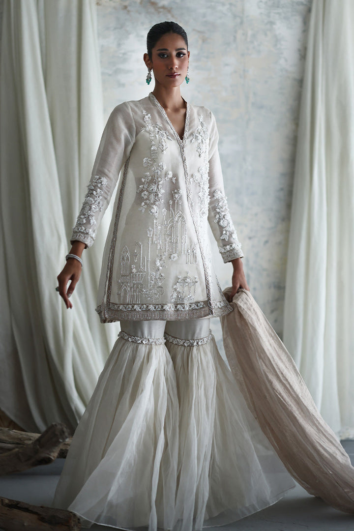 Sheer organza brings fluidity to this screen-printed chogha, where florals and Mughal-inspired motifs are elevated with hand-done embellishments that shimmer softly with movement. Paired with a matching gharara in an airy organza, sparkles with hints of matching detailing, the ensemble plays with transparency, light, and layered texture. A luminous gold dupatta adds polish with its handcrafted edging a refined choice for soft statements.