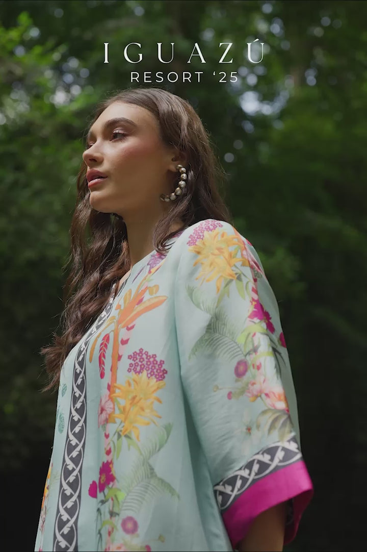 This printed set feels like a walk through a garden in full bloom. A base of sky blue silk reads serene, while flowers in saturated hues dance across it in a burst of energy. The shirt’s flowing line and the culottes’ swing add to the sense of movement, while magenta edging frames the playfulness with clarity.