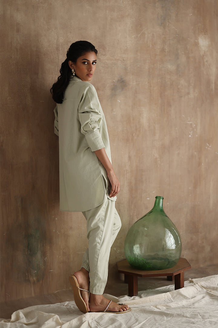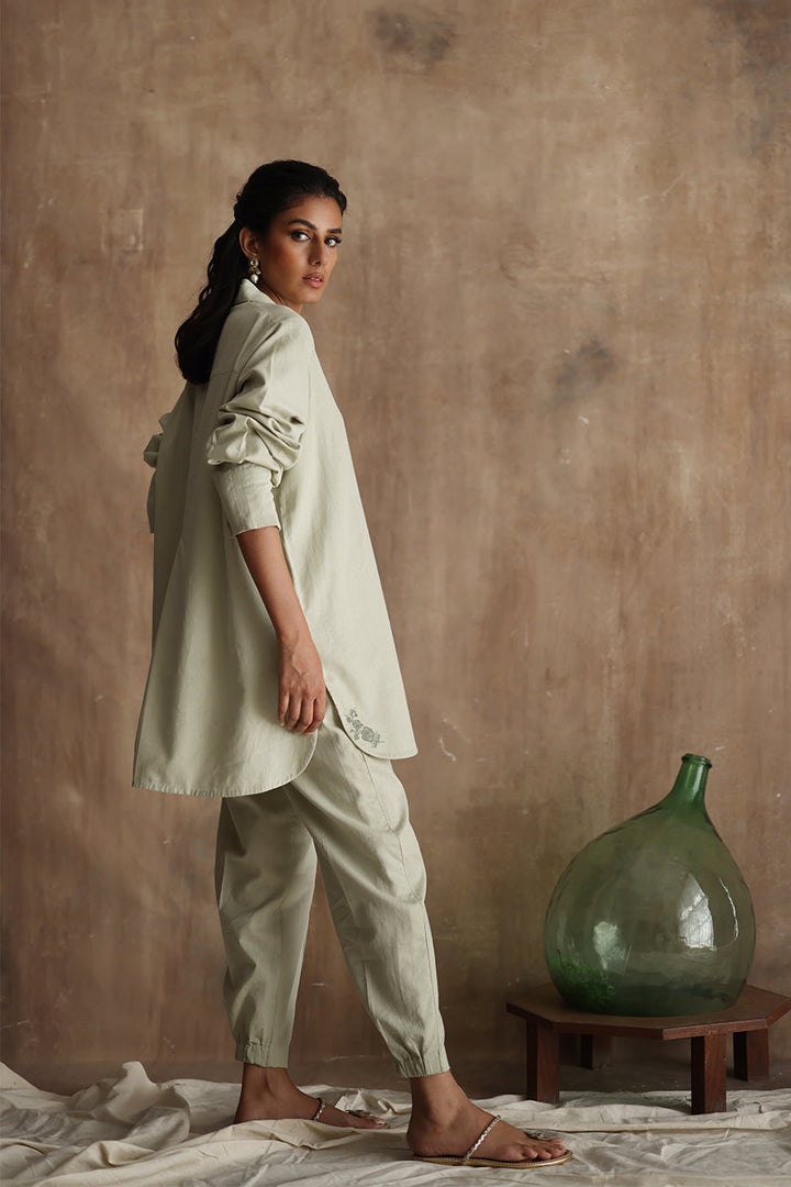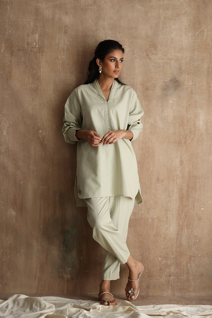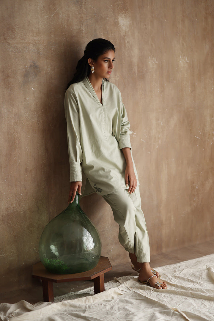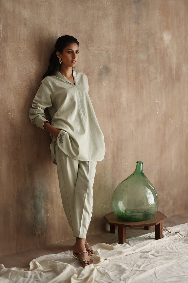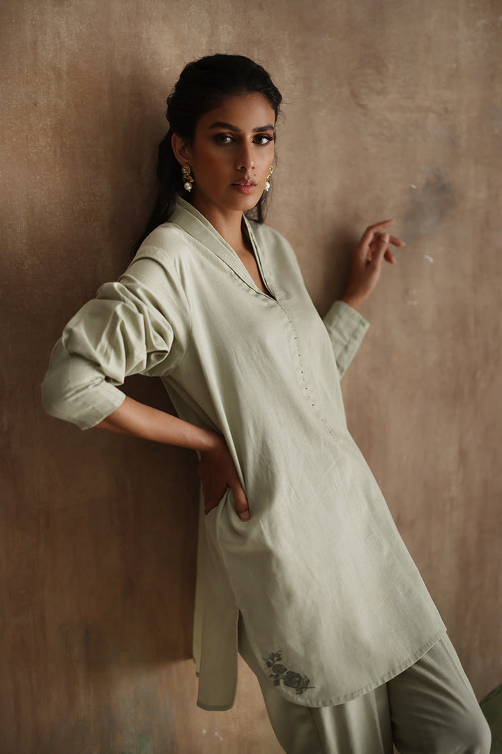 "Seraphine," an exquisite ensemble crafted from luxurious Irish Linen fabric. This stunning outfit features a short shirt with a double collar and intricate machine embroidery detailing on the kurta Patti.