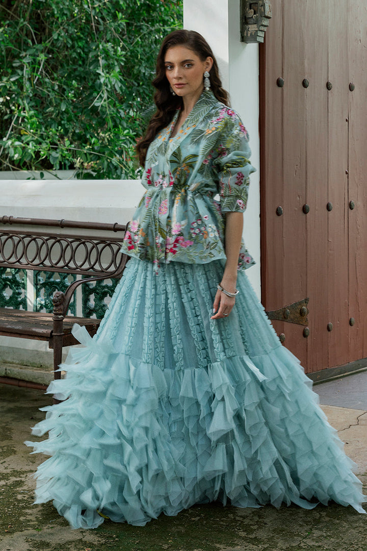 Sage organza catches the light like morning mist, its surface alive with embroidered tropical botanicals and avians. The peplum jacket is embroidered in a painter’s palette — verdant greens, sweet pinks, bursts of orange and red — every inch worked to create a mesmerizing tableau. Lapels bring quiet structure, and the tasseled tie at the waist finishes it with an accented nod to craft. Beneath, the camisole in khadi silk offers a smooth tonal ground, letting the colors remain soft and luminous. Paired with a skirt that plays with texture; lines of ruffles fall from the waist, creating airy columns of dimension, before giving way to tiers of fringe and ruffles that add volume and swing to the flared silhouette. The result is an ensemble that turns a soft hue into a full composition of light and shadow.