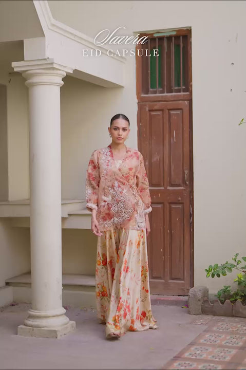 Delivery in 3 WeeksSoftly layered, this printed ensemble carries a graceful ease. The beige organza wrap jacket drapes lightly, animated with blooming florals and perched birds that asymmetrically mark the length and sleeves. Cutwork embroidery and textural hand embellishments in sequin, bead, and zardozi lend a quiet shimmer, while tassels at the front tie sway gently. The charmeuse silk camisole and flared pants beneath create a continuous field of warm floral print, allowing the jacket to feel light and expressive. This ensemble strikes an unhurried balance of detail and movement.