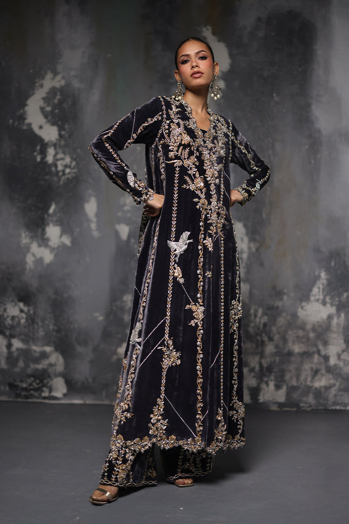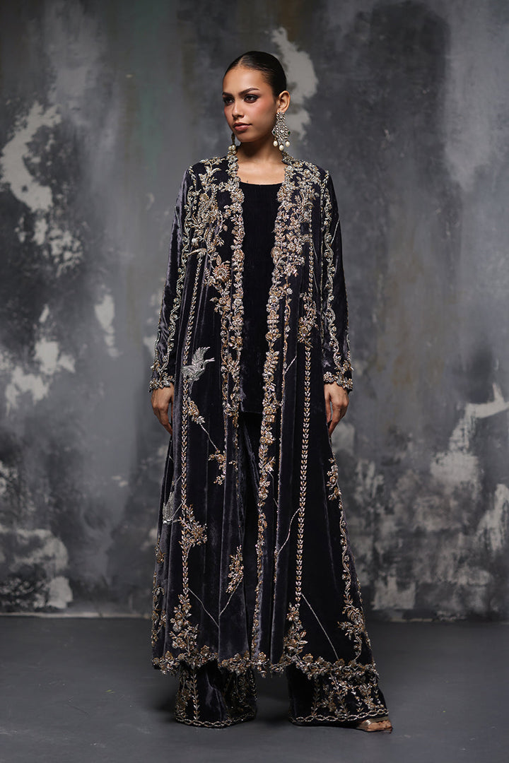 Evoking Mughal artistry, this charcoal velvet three-piece set is hand-embroidered in zardozi, sequins, and kamdani threads of gold, copper, and silver. From the shoulders, the chogha blooms with ornate floral vines, the neckline detailed with intricate flowering tendrils that trail down the front, while geometric columns accented with avian forms and blooming bouquets adorn the length. Sleeves carry delicate trails, ending in flowery cuffs that mirror the neckline. Blooming patterns line the hem, traced with cutwork embroidery like the neckline, placket and cuffs, heighten the dynamism of the piece. The solid mid-thigh camisole and embroidered izaar continue the grand spirit, its relaxed hems echoing the artistry in form and craft. Regal in tone yet versatile in wear, this set is a masterclass in handcrafted opulence.