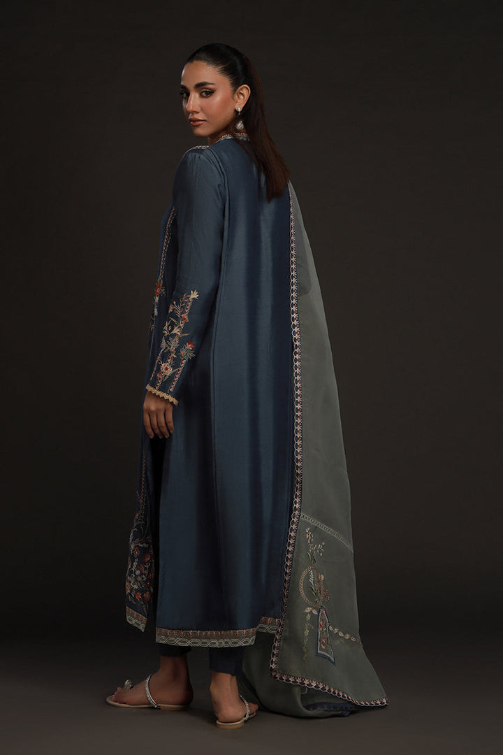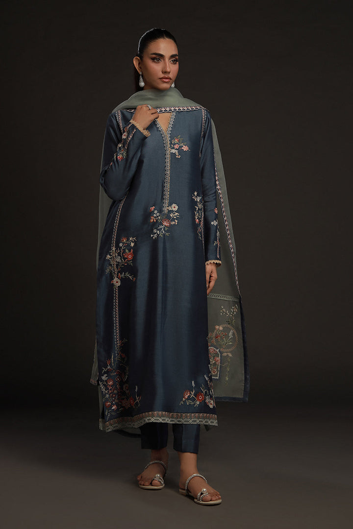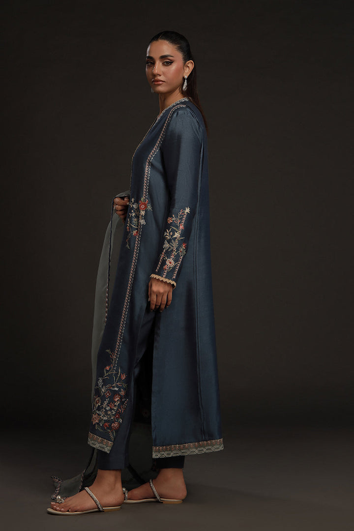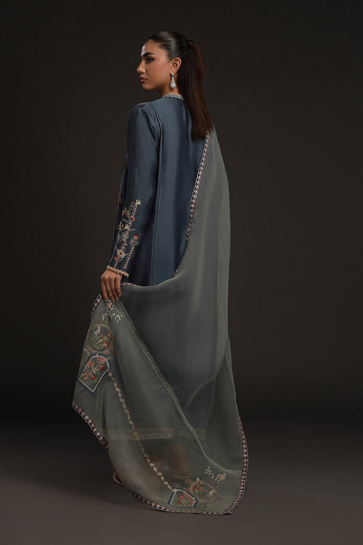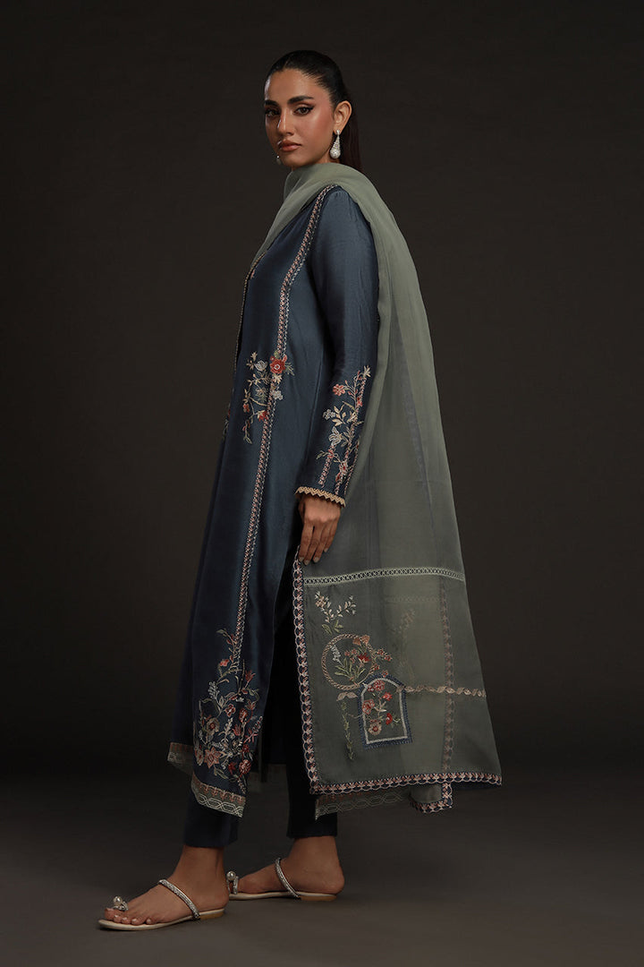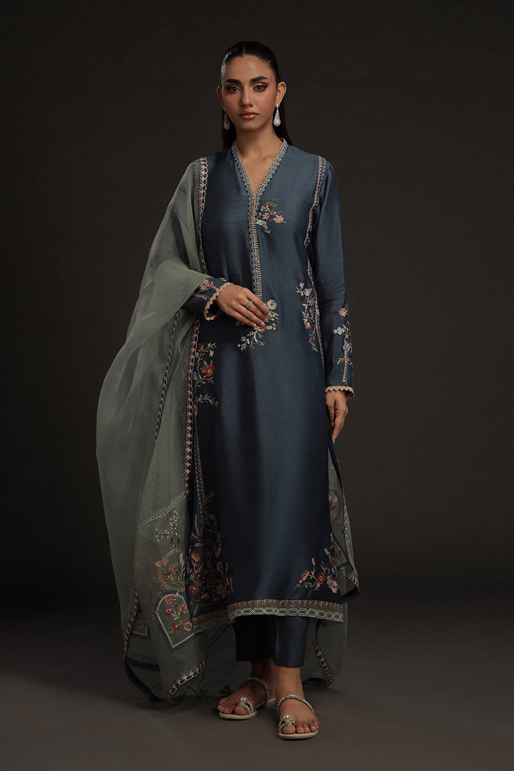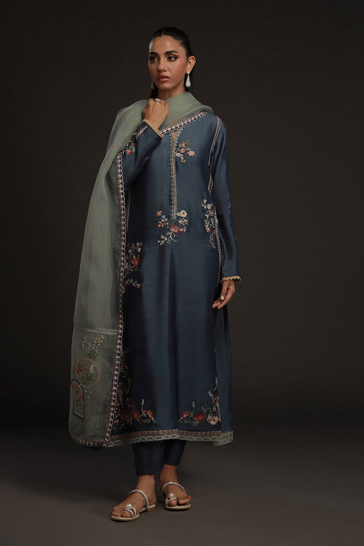 Understated but quietly striking, this look pairs a steely blue khaddi silk kurta with straight tonal pants for a column of calm color. Embroidery in soft beige and muted orange forms floral bouquets and geometric details along its length, neckline and hem — subtle, deliberate, refined. The mint blue organza dupatta softens the look, adorned with florals and patterns in a matching palette. The result is poised and serene, a look that never feels overdone.