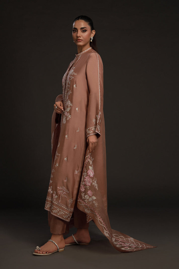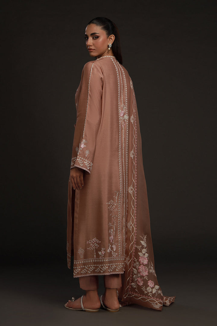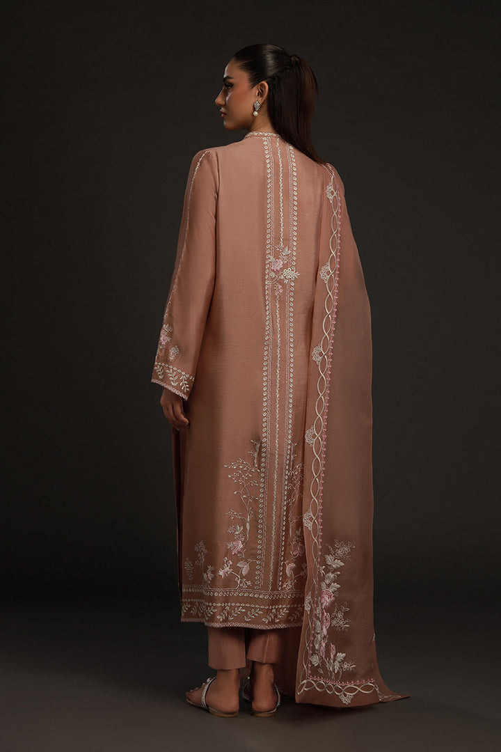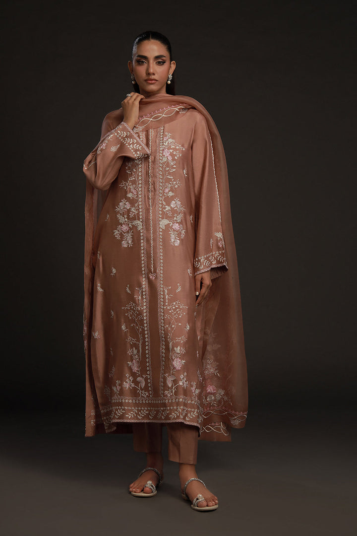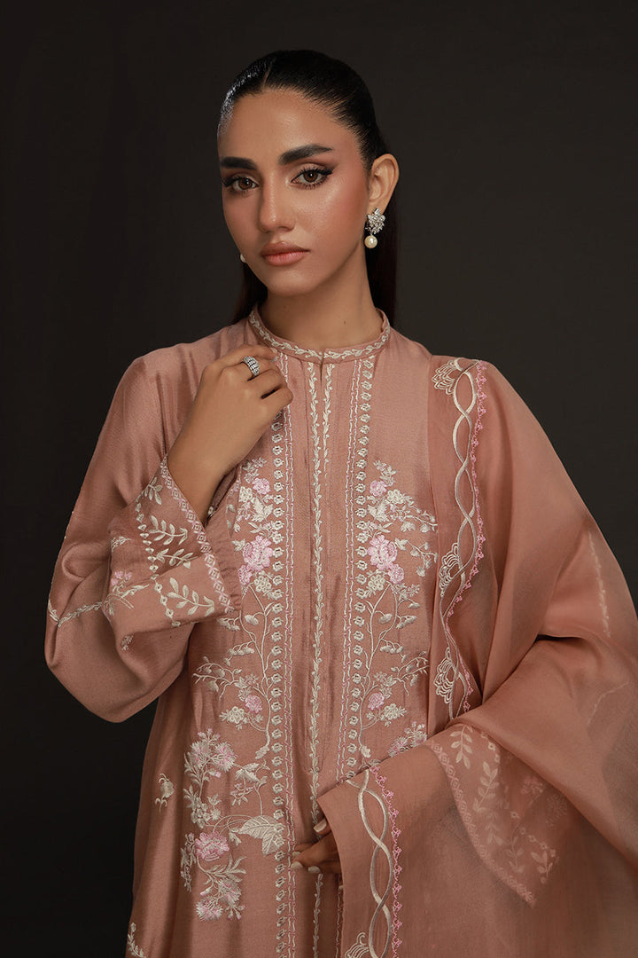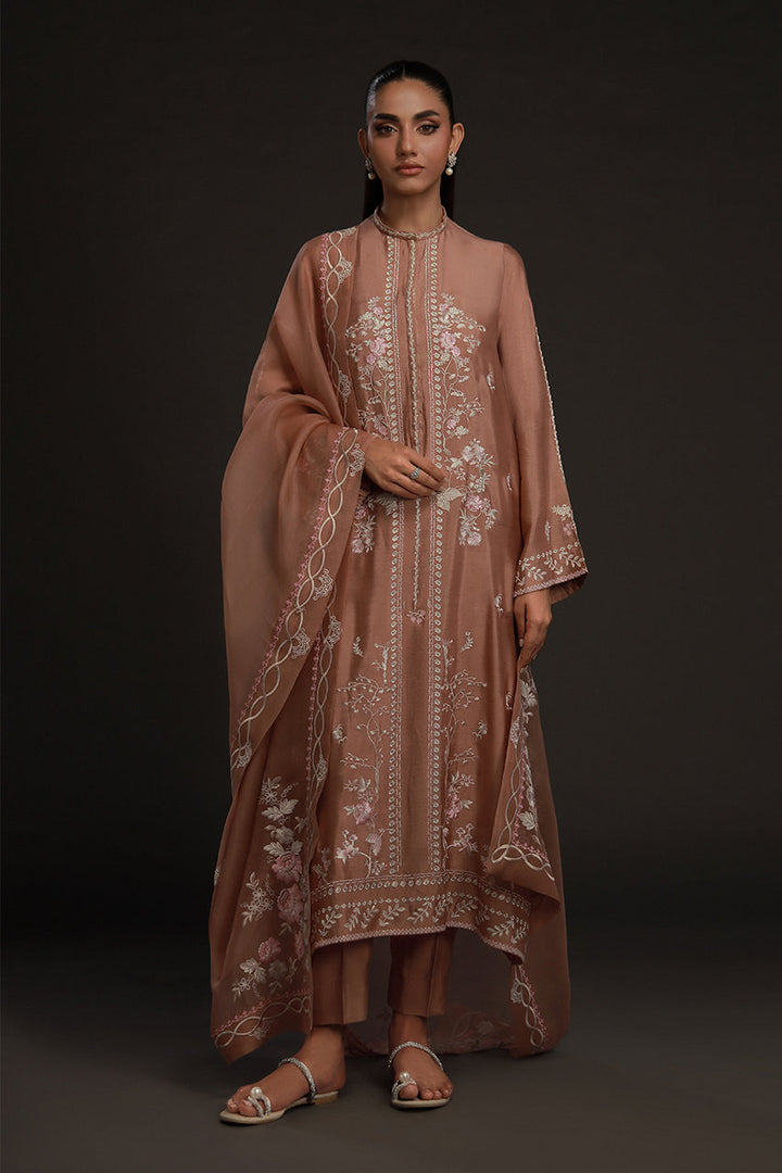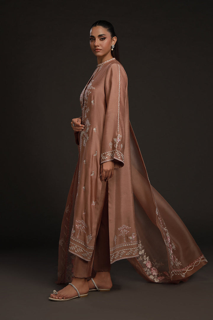 The beauty of this ensemble lies in its subtle surface work. The long straight kameez, rendered in muted blush khaddi silk, is embroidered with botanical florals that bloom along the bodice and hem, with finer details along the sleeves for balance. The matching khaddi silk pants are left plain for a sleek elongation. The tonal organza dupatta carries the same white and pink embroidery language — borders lined in threadwork and pallus marked with bolder floral motifs, softened by its sheerness.