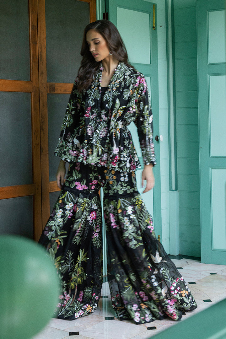 Color bursts against black, turning the sheer organza canvas into a tropical garden. Shades of green, pink, orange, red, and white weave together in lush harmony, evoking spring in full bloom. The peplum jacket is drenched in embroidery, its dimensional surface layered with hand-placed silver sequins and fine zardozi work. Shimmering sequined accents trace the hems and sleeves for a playful flourish. Beneath it, a solid khadi silk camisole provides a tonal anchor. The gharara continues the threadwork story with motifs flowing down from the waist and trailing up the voluminous hem, in a vivid crescendo. Together, the trio reads dramatic and deliberate — a tropical vision refined for special evenings.