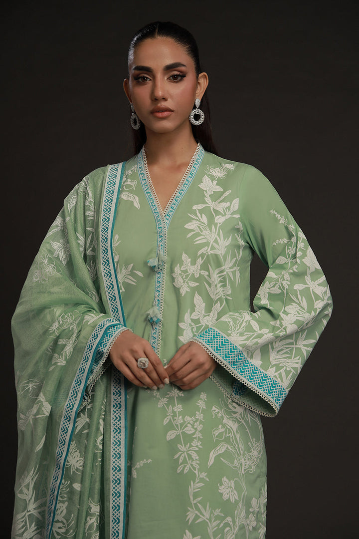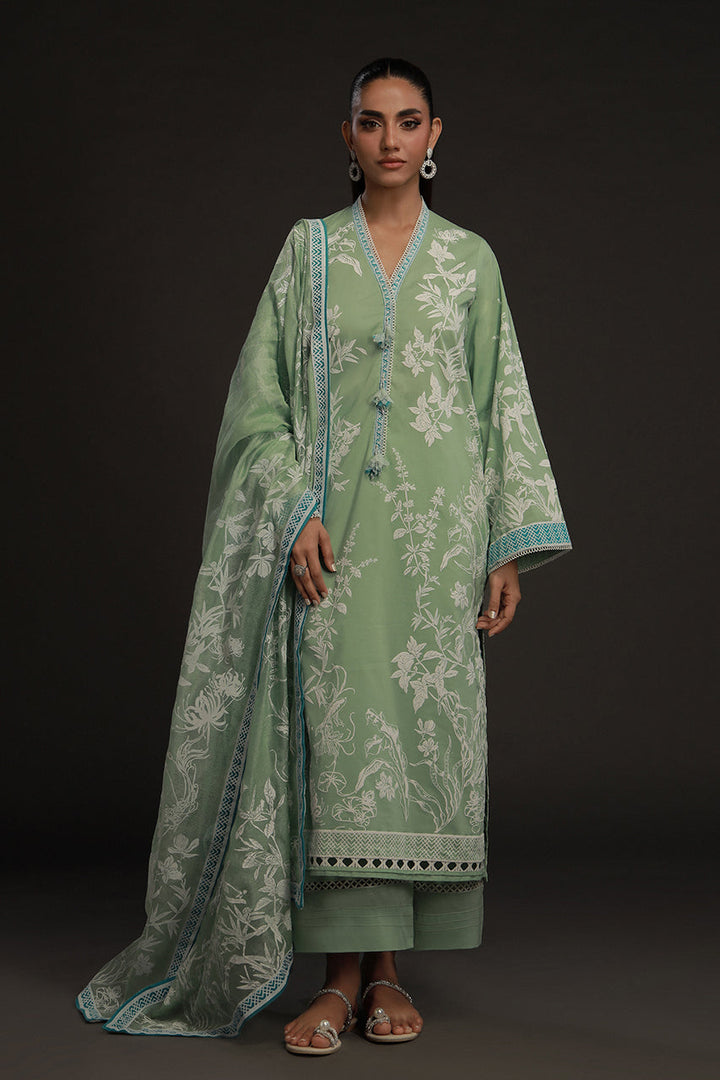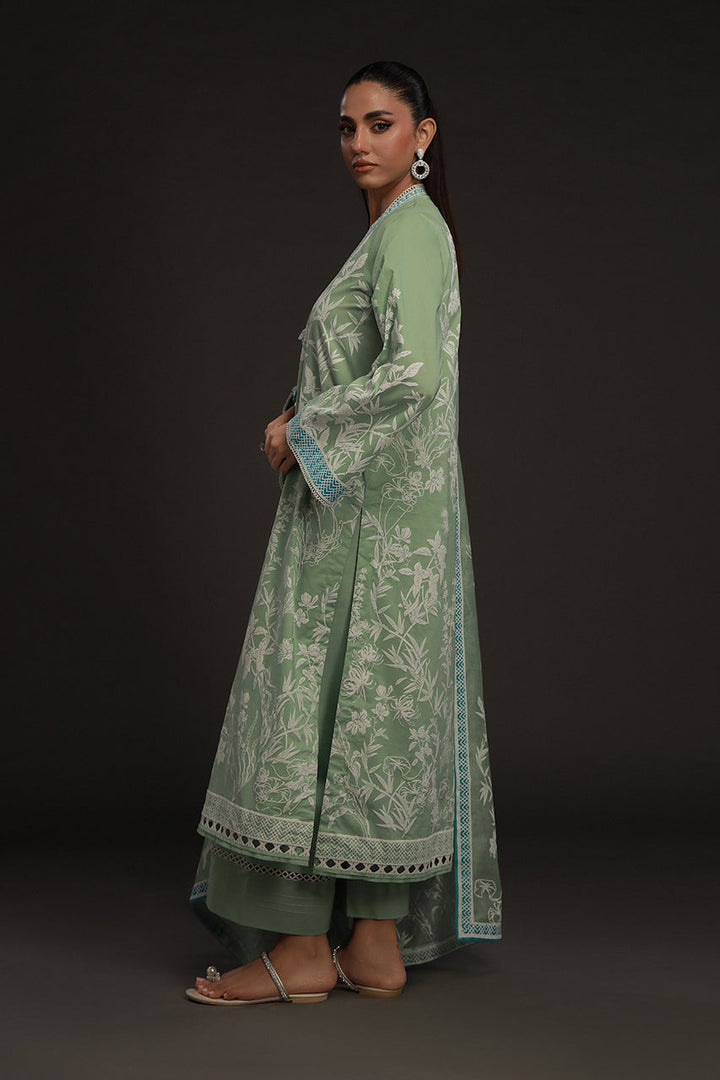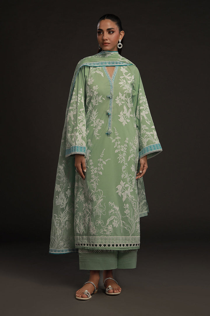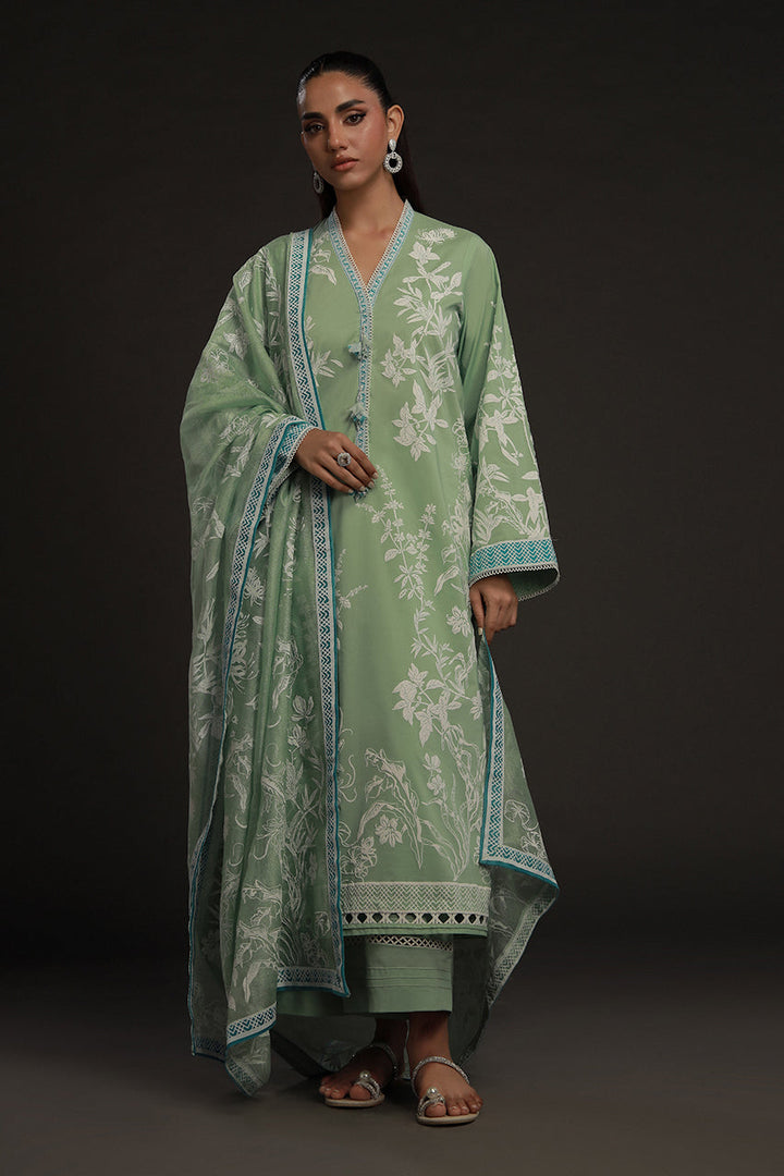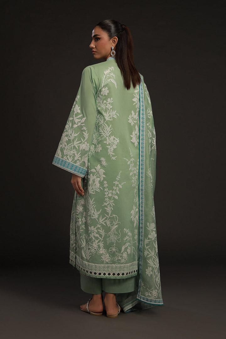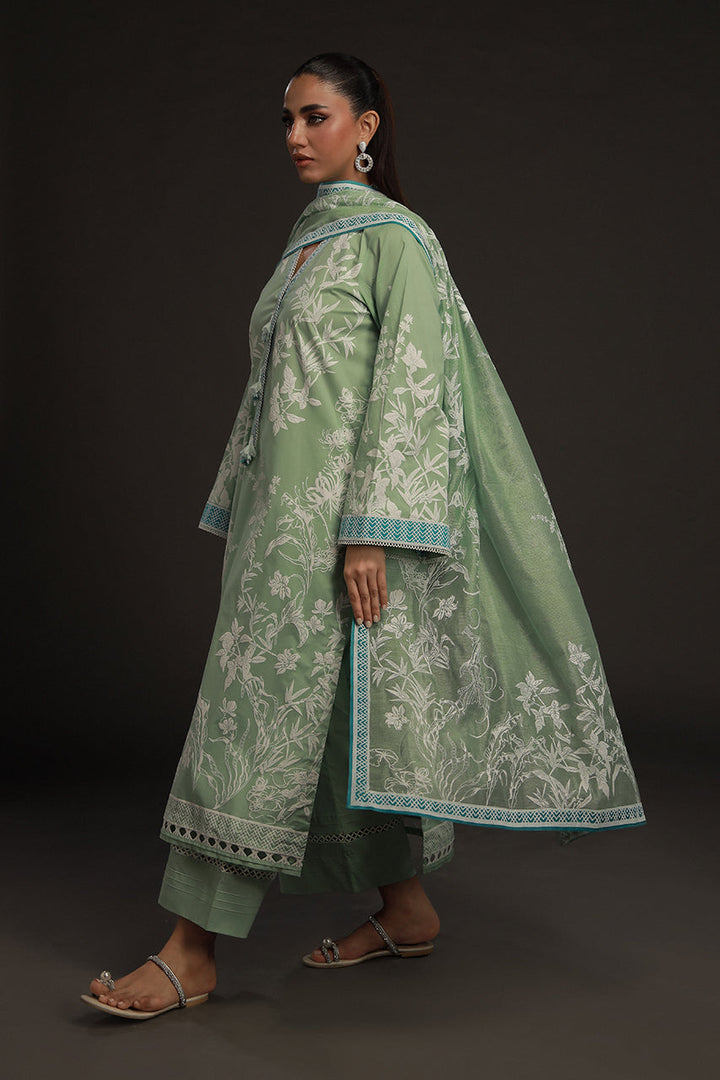 This is a look that moves with ease and stays light on the senses. The cotton shirt, in a soothing green hue, flows long and straight, its surface traced with delicate screen-printed floral vines in white. Blue-edged neckline and sleeves break the monochrome palette, while handmade floral tassels on the placket add subtle movement. The matching izaar grounds the set with its subtle details, while the cotton net dupatta, screen-printed and bordered in blue, adds airy volume in movement.
