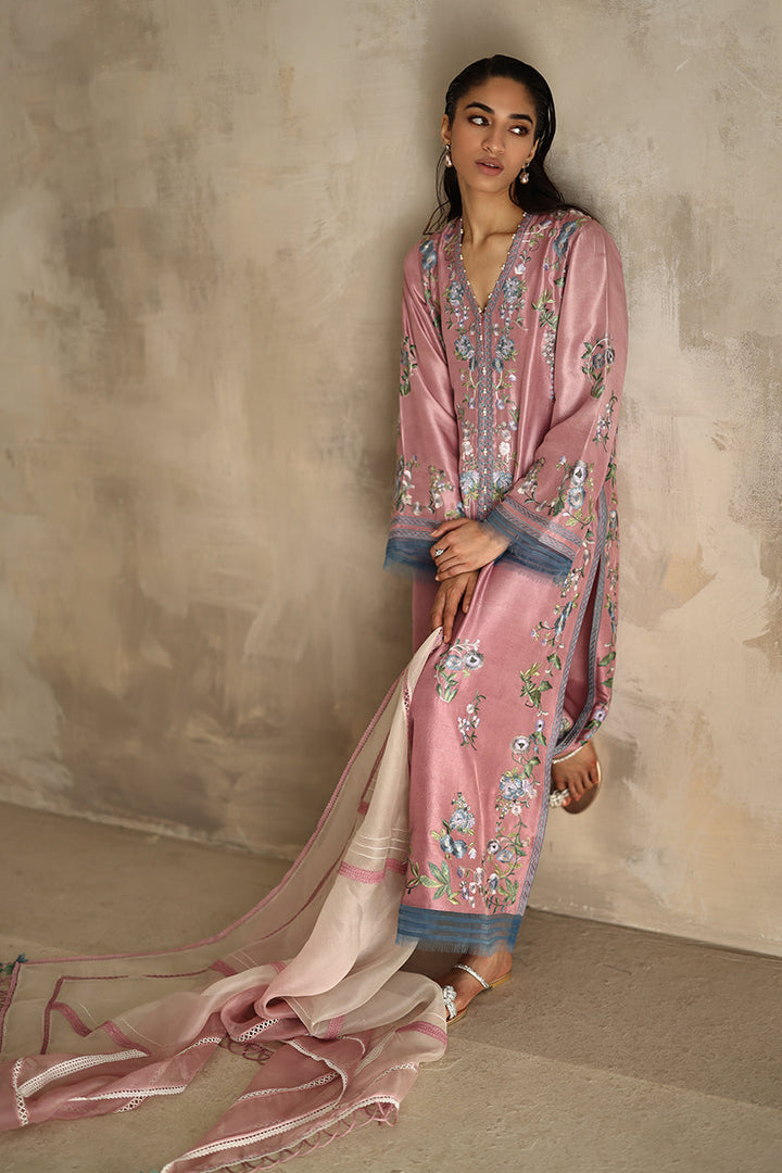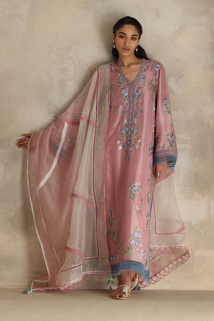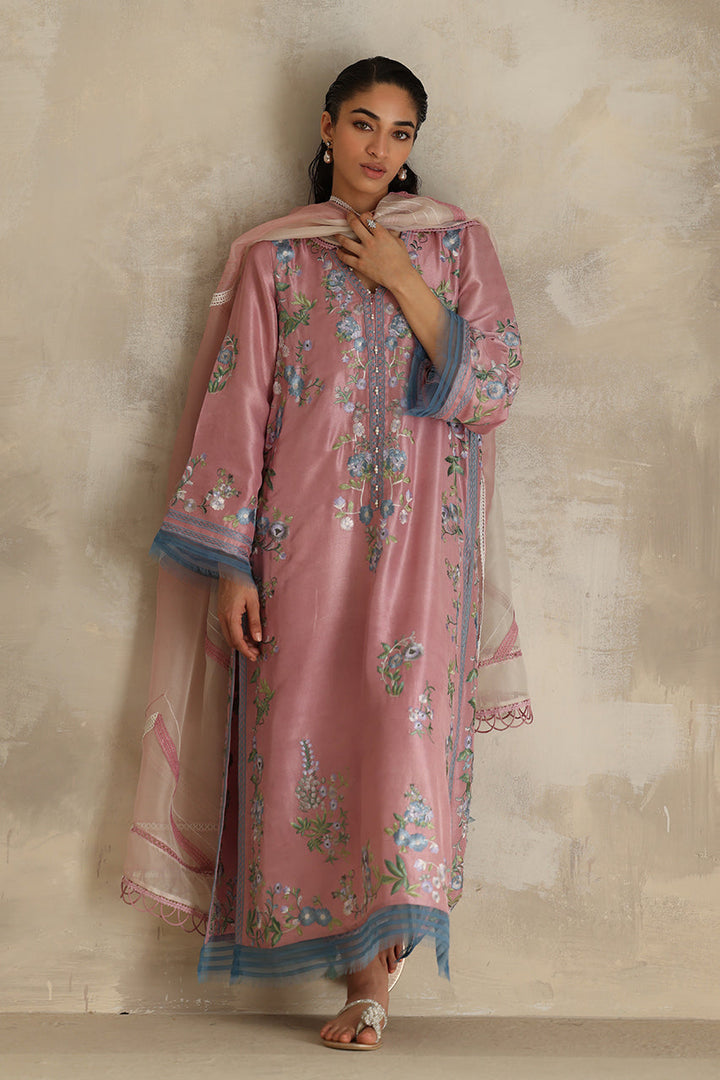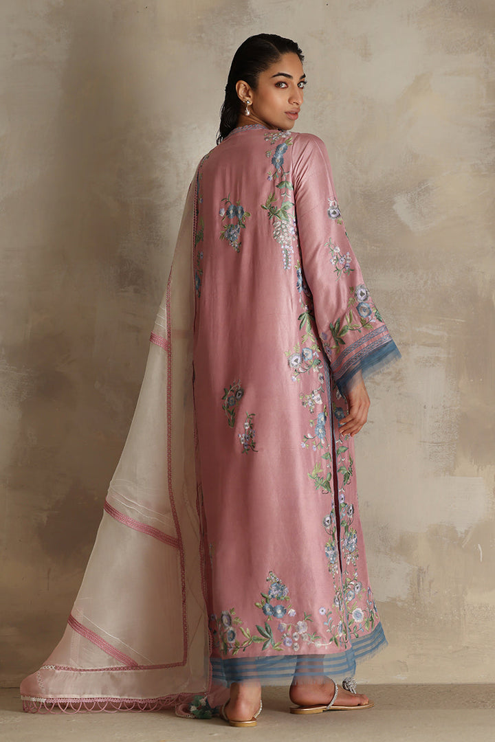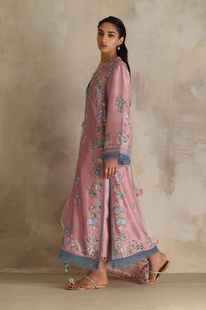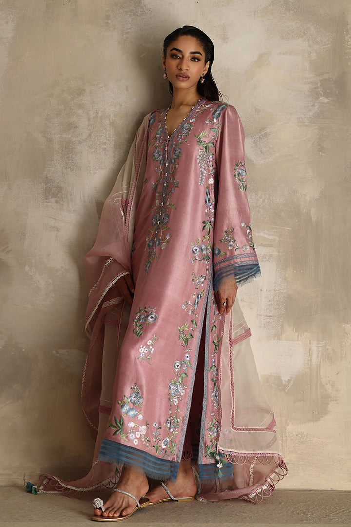 Radiating refined charm, this raw silk shirt in a delicate shade of pink features intricate floral embroidery, adding timeless elegance to the design. Paired with textured pants for a touch of contemporary sophistication, the ensemble is completed with a pure organza dupatta, finished with delicate lace detailing, creating a look that is both graceful and effortlessly stylish.