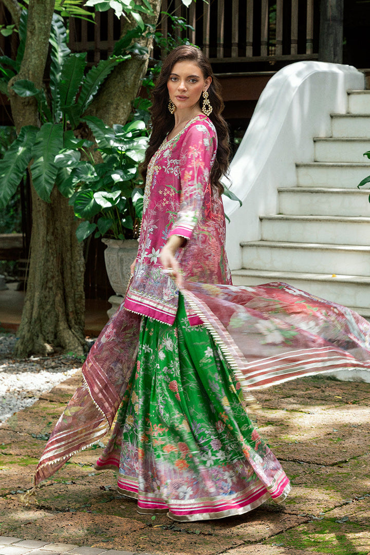 Festive in spirit, this ensemble reveals its grandness in motion. The bright pink khaddi silk kameez, alive with an abstract floral print, gathers brilliance at the neckline where silver and gold zardozi embroidery melds with sequins, beads, and gota. From the placket, crystal tassels swing, catching the light with subtle glimmer. Sleeves and hems carry delicate sequin and zari work, finished with gota trims. In contrast, the parrot green khaddi silk gharara unfurls with dramatic sweep, its matching print accented with gota edging that gleams with each step. Completing the rhythm, an organza dupatta hovers lightly in sheer pink, similarly patterned and framed with gota borders and tasseled corners. Together, this look is a festive harmony of color, craft, and cut.